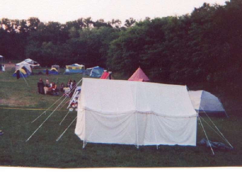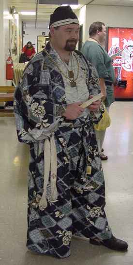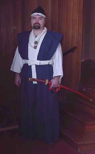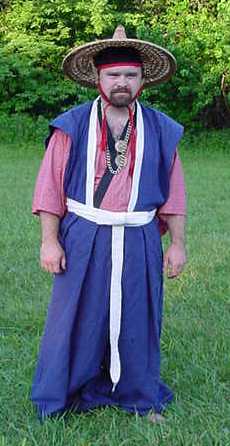 Yamabushi clothes: overcoat blue sheer silk, white kosode, light green linen hakama, tekou (forearm covers) and horogai/habaki/kyahan (shinguards in cotton). Most of this costume was finished by hand as the machine blew up. 2 Pennsic days were spent finishing it, so Sato could visit his S.C.A. father in full monkly dress. |