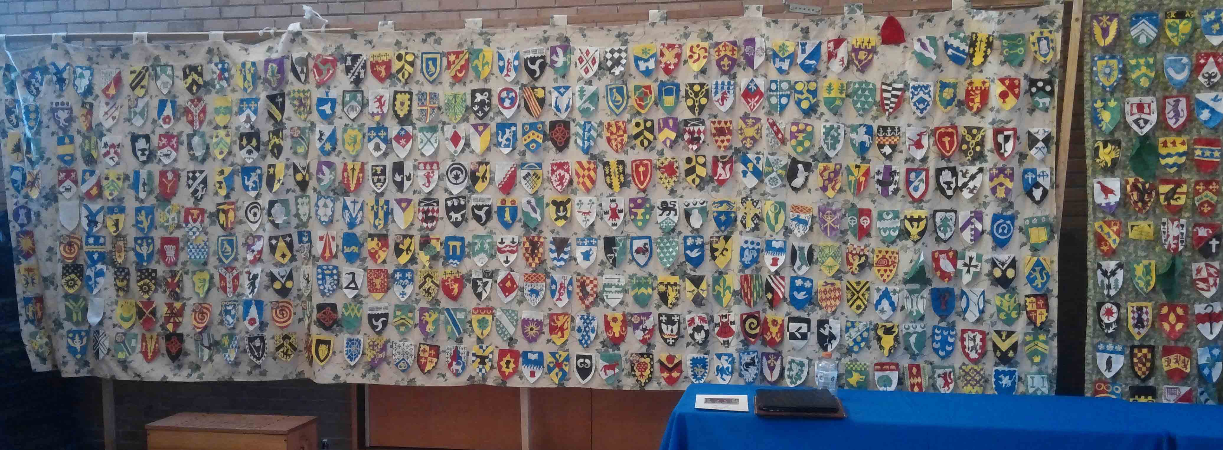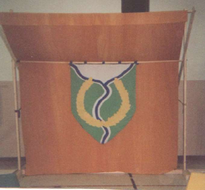 | Wall hangings based on illuminated letter backgrounds. The structure is to make them mobile as one cannot peg walls in rented halls(the correct way to hang them). they also have loops to facilitate either a rod or rope to be run through them, depending on where they are to be hung agaisnt a wall, over a doorway(to hide/block access) across a roomto divide it into samller rooms or chambers, to hide the uglies in say a bingo hall site. | Another wall hanging based on on illuminated letter backgrounds |