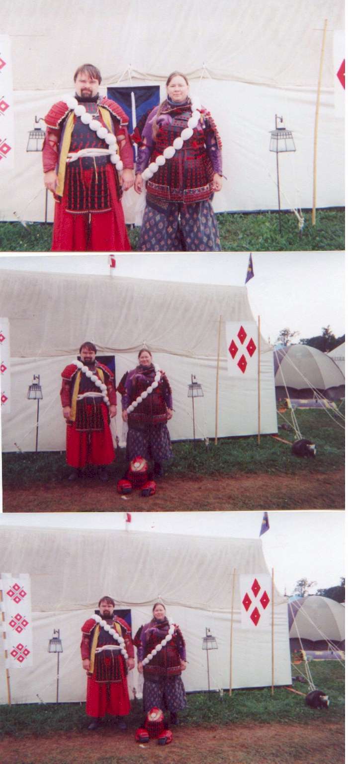 The shakujo is a shakujo yari made by Sato’s squire Thadeus McTyre. The top is a three part casting in brass. The staff is octagonal in cross section which is traditional for pilgrim’s staffs even today in climbing Fuji-san. The brass endcap is to keep the bottom from wearing shorter. The brass bands hide the release mechanism for the blade, as Sato says "I don’t necessarily as good a monk as I could be." I got the correct terms from japanese art and samurai books, then Sato did the web research and sent it on to Thadeus. The blazon in the center of the six rings is a simplified version of Sato’s devise in the society-he didn’t quite give up the ‘outside world’ while being a monk. In reality, many samurai took vows, entering the cloistered world of the monestary and would later exit the monestary as recalled by their overlord or family business etc. Sato was not pleased with the shin guards, so I will be working on improvements to the design. Still to make for the monkly stuff-