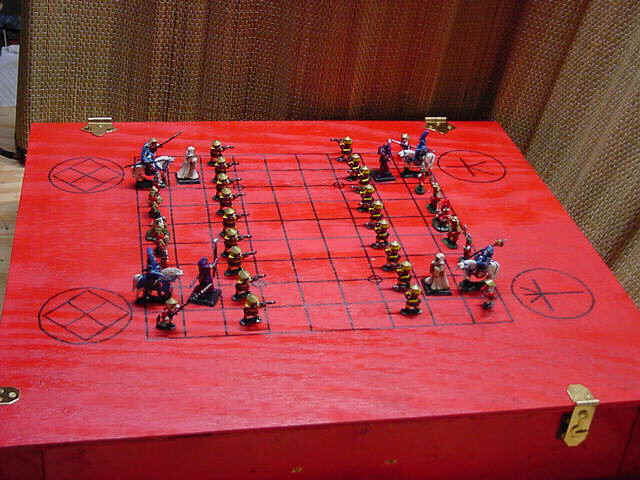 This year I got to play Tai-Shogi for the 2nd time. I made a Tai-Shogi set a while back. Took us forever to setup all the pieces. Tai-shogi is alot bigger than shogi and was played by the Imperial court. It has a 25 squares by 25 squares board. And 177 pieces per side. It took Hawkel and I 12 hours to play 1 complete game. This game was interesting because it teaches large troop movement and counter movement. |